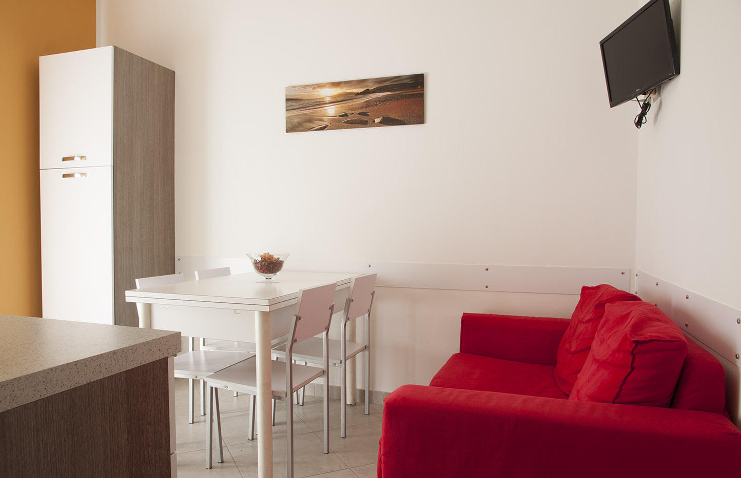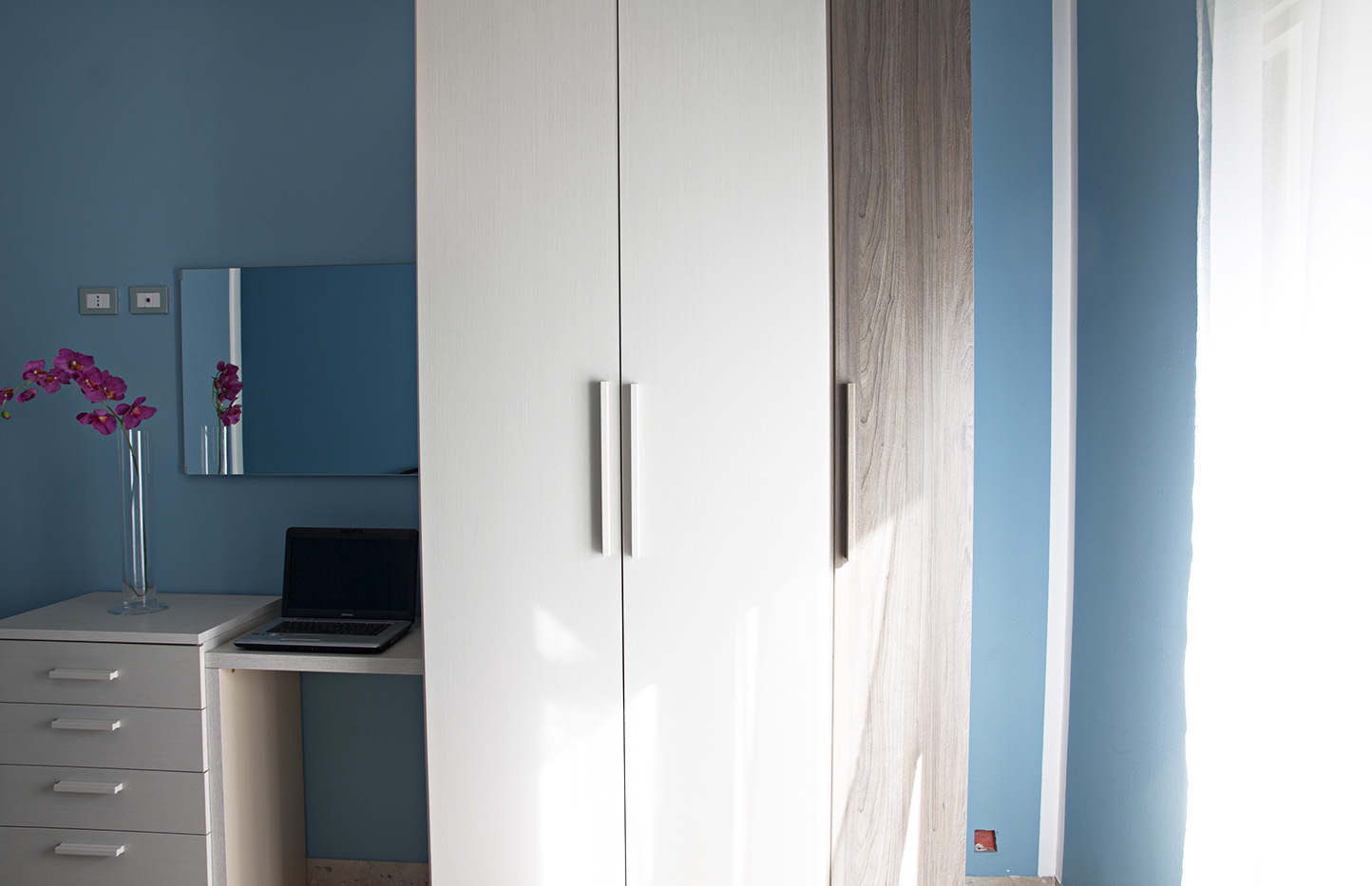 This flat can comfortably accommodate five people in two bedrooms. One of these is a double room with twin beds, a wardrobe, desk and a chest of drawers.