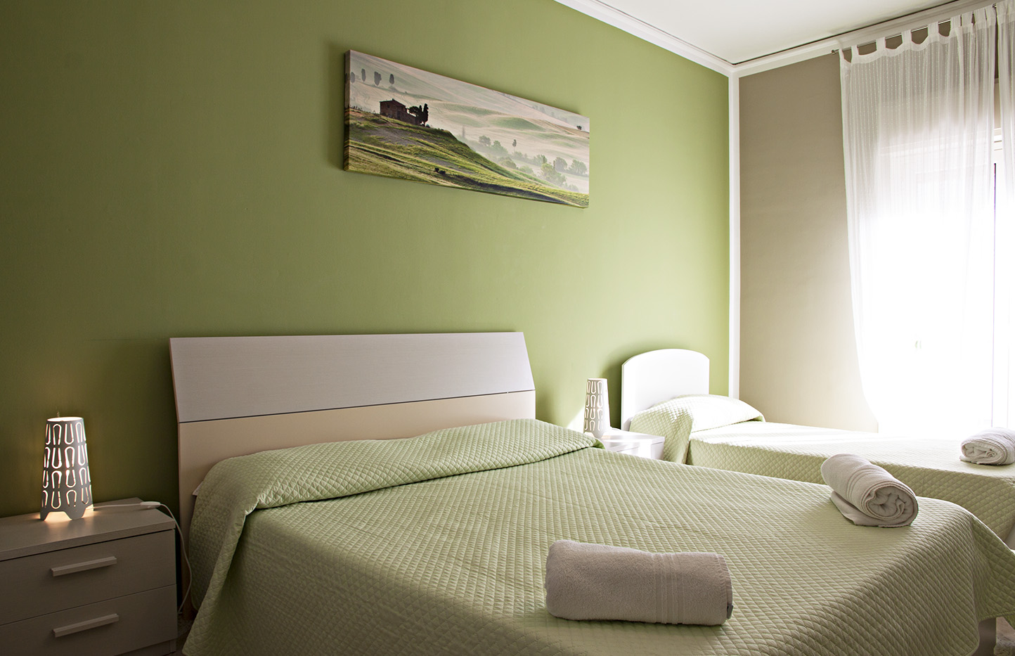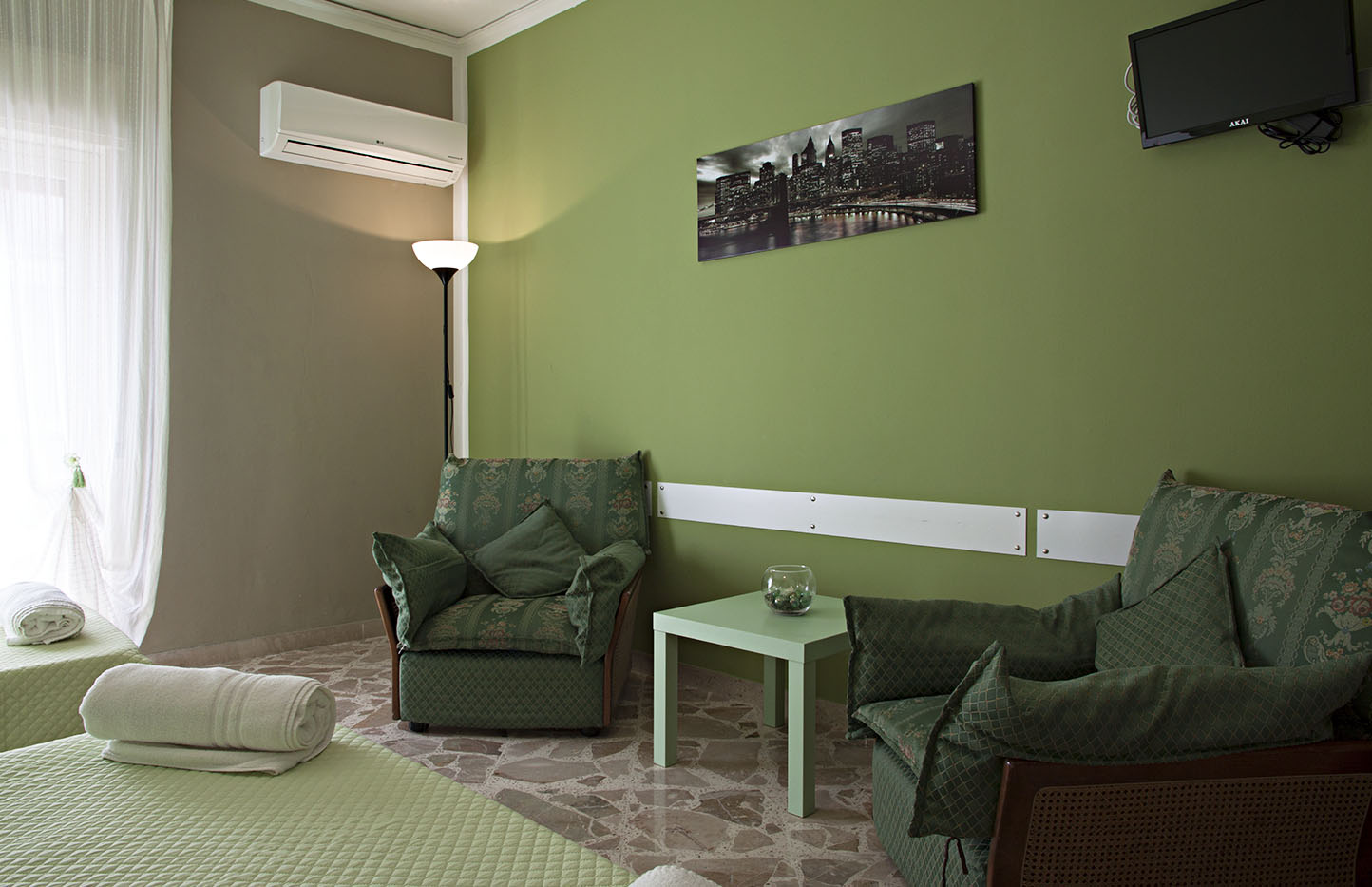 The other one is a triple room with one double and one single beds, a large wardrobe and a little lounge area with two armchairs.