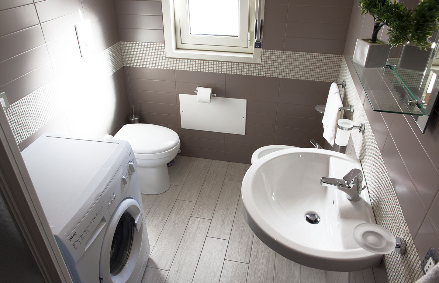 1 bathroom with shower, toilet, washing machine and hair dryer